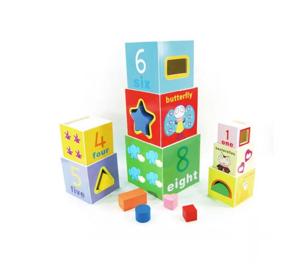 1. The set consists of 8 wooden cubes of different sizes (successive) so that the cubes fit into each other, and placed on top of each other form a pyramid, or a tall tower.