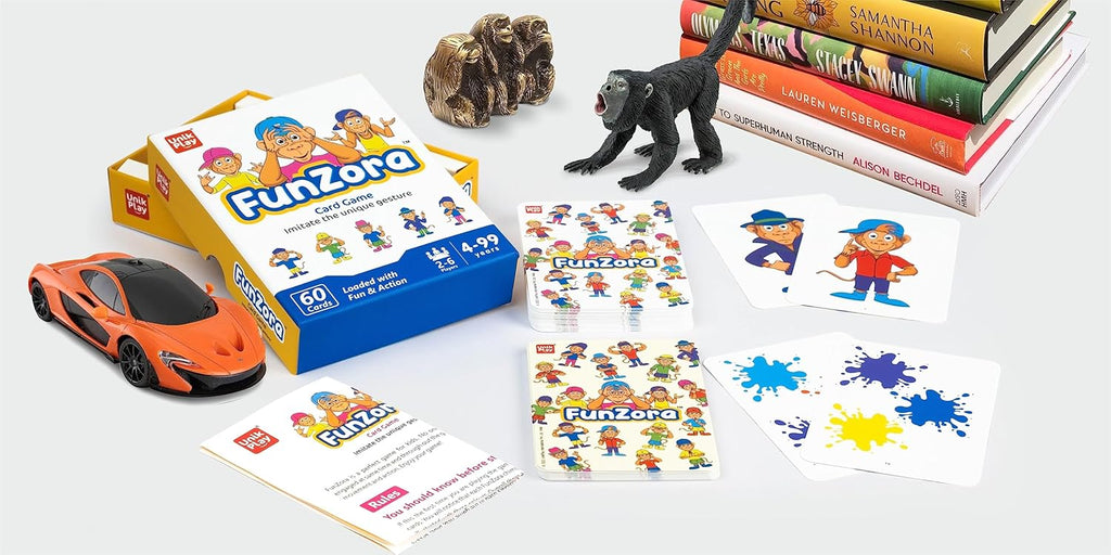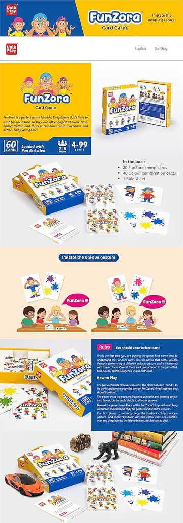 Contains: 20Funzora Chimp Cards. 40 Colour Cards. 1 Rule sheet. How to play: Collect these cards by matching the colour cards to the correct colours on each FunZora Chimp and then copy its unique gesture. The first player to correctly copy the FunZora chimp's unique gesture and shout "FunZora" wins the colur card. Dimensions: 14*11*3 (H*B*W)