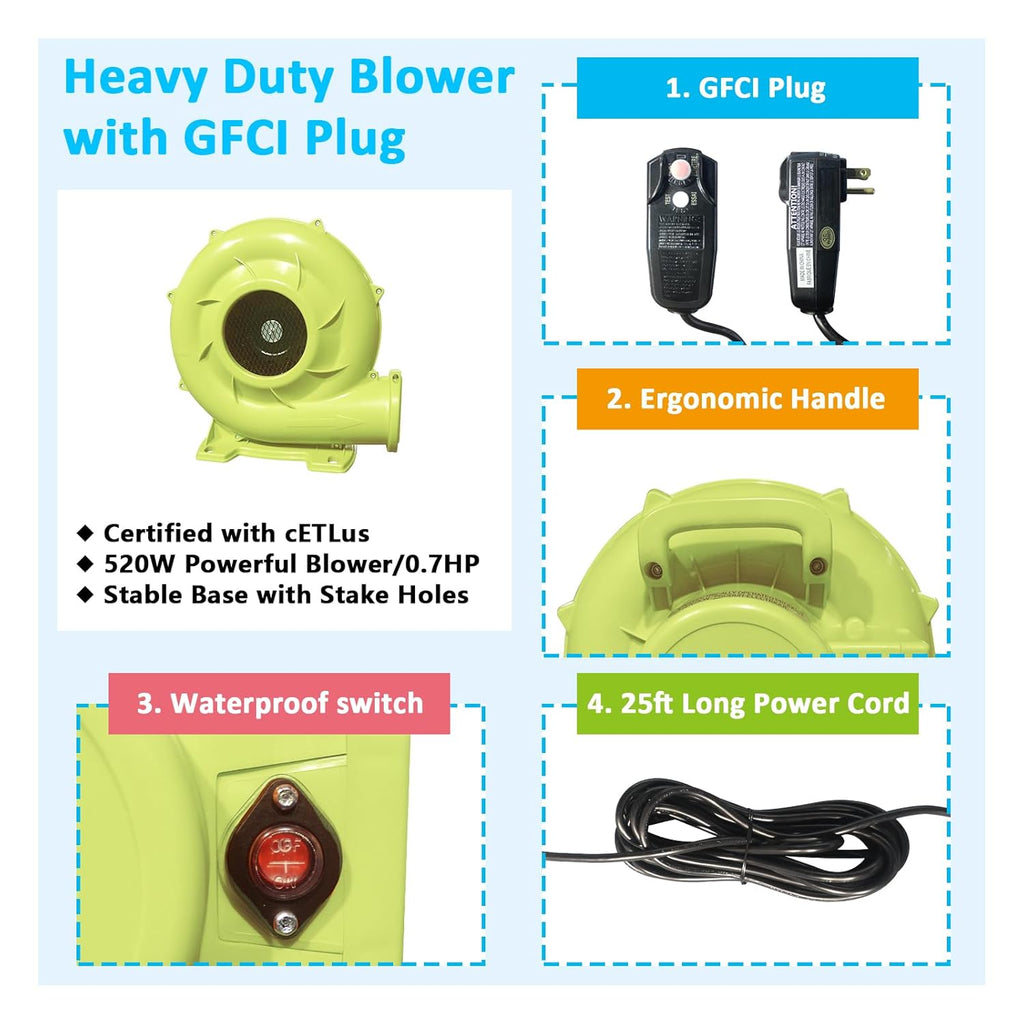 Easy Mounting and Dismounting - The inflatable water slide castle can be quickly inflated and then used in minutes that perfect for outdoor use in parks, turf, backyards and more. The included carrying bag portability for carrying and storage which allowing your kids play happily anytime and anywhere.