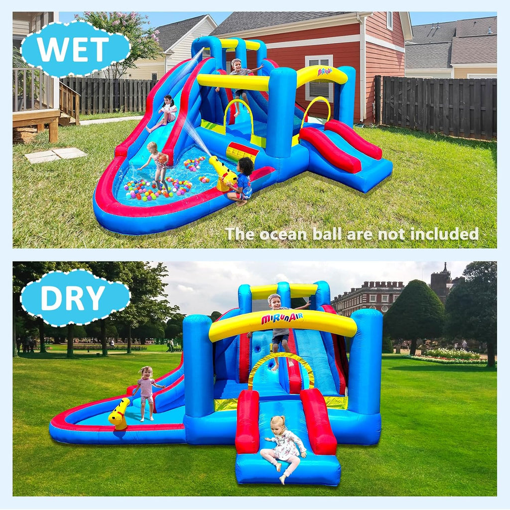 Multi Play Water Slides - The 160 x 148 x 82 inches backyard water park comes with two short slide, a long curved water slide, a bigsized splash pool, a climb wall and a water cannon. Variety of ways to play that will provide continuous happiness for children. The blow up water slides is Ideal for family recreation. Weight limit: Max total weight 350 lbs.