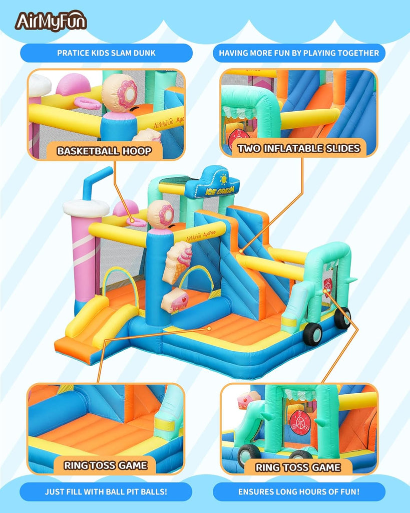 Multiple Functions & Colorful Design: This bouncy castle is designed with an ice cream truck theme which is full of childishness attract kids to play for hours and enjoy the fun.